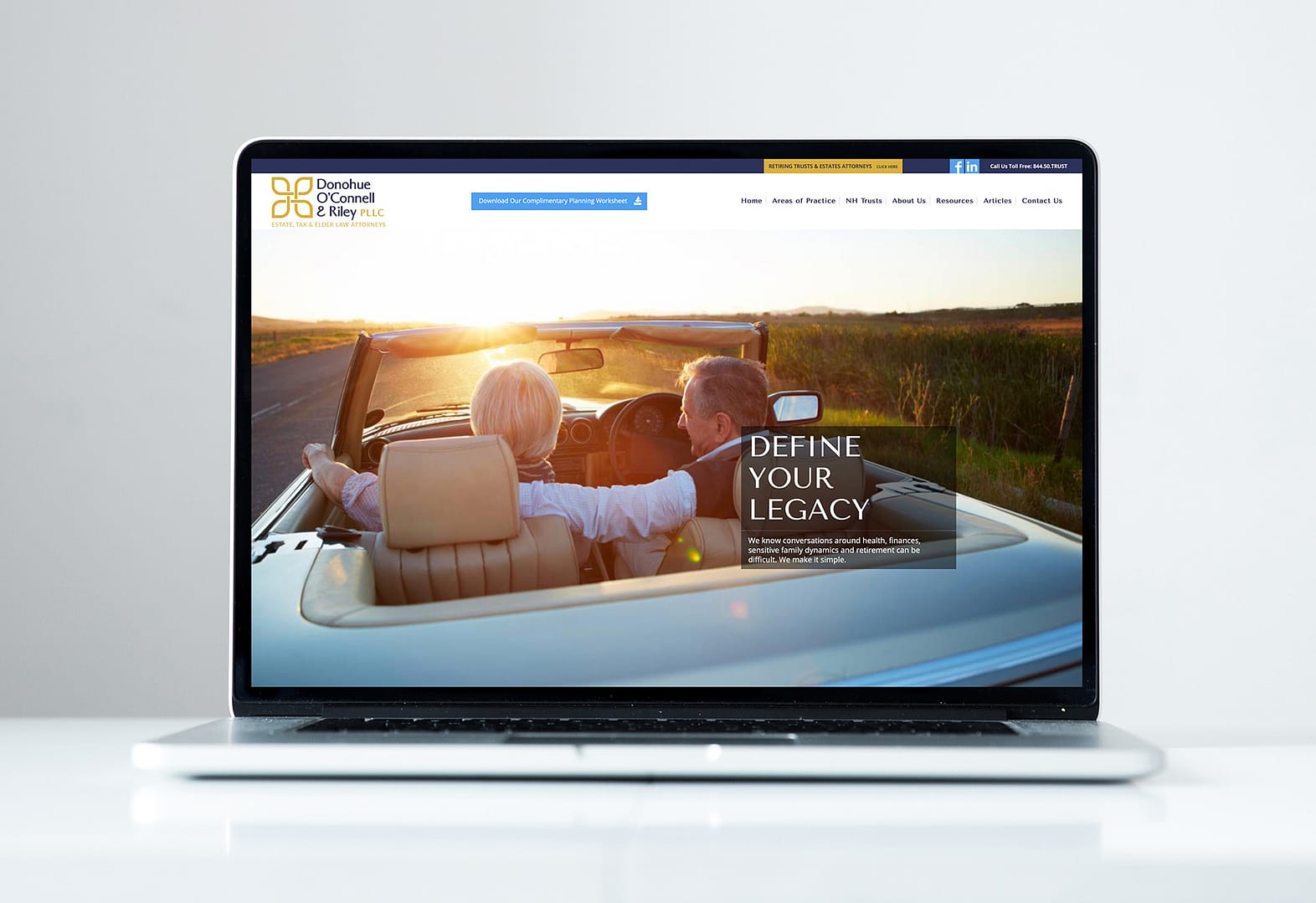 As the only eldercare law practice focused on NY and NH, they understand fully that their clients want peace of mind in knowing their assets are taken care of in perpetuity. The essence of the brand lay in what we learned about its founder, Joe Donohue. Numerous calls with clients and employees revealed that Joe “Goes Above and Beyond” for his clients; a perfect brand metaphor and the jumping off point for the logo design, the color palette and the messaging.